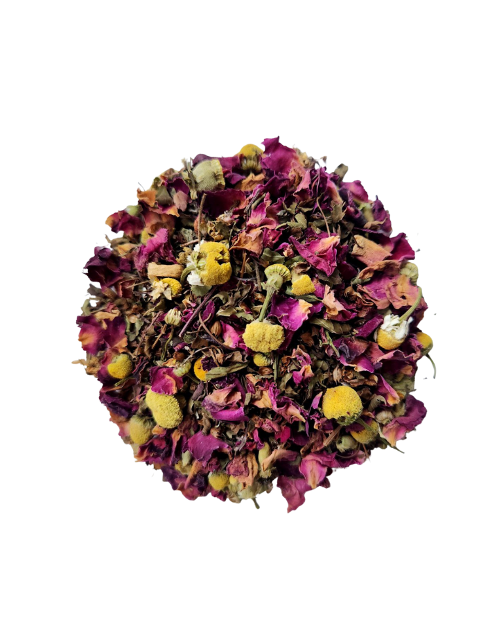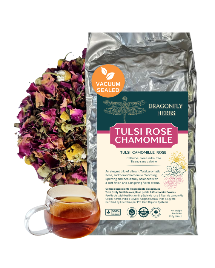 Whole fragrant chamomile flowers, delicate rose petals, and sacred Tulsi leaf expertly crafted for balance. This delightful herbal tea offers floral depth and gentle sweetness, and light spice in every cup.